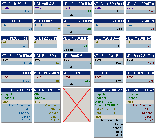 09Sep06: While cleaning out duplicate source code & modules, I came across two module updates that slipped through the cracks. First, GuiList2GuiBool was updated to version 1.1.1 on 28Aug06, which fixes an issue with 'List Choices' that prevented the expected values from being output. Download it from here: KDL_GuiList2GuiBool. Secondly, Volts2GuiBool was updated to version 1.0.5 on 31Jan06. I've slept since January, so I don't remember what I fixed in that module now. You can get the newer version from here: KDL_Volts2GuiBool. Both packs (GUI2GUI and DSP2GUI) now contain these two updates as well, now.